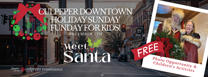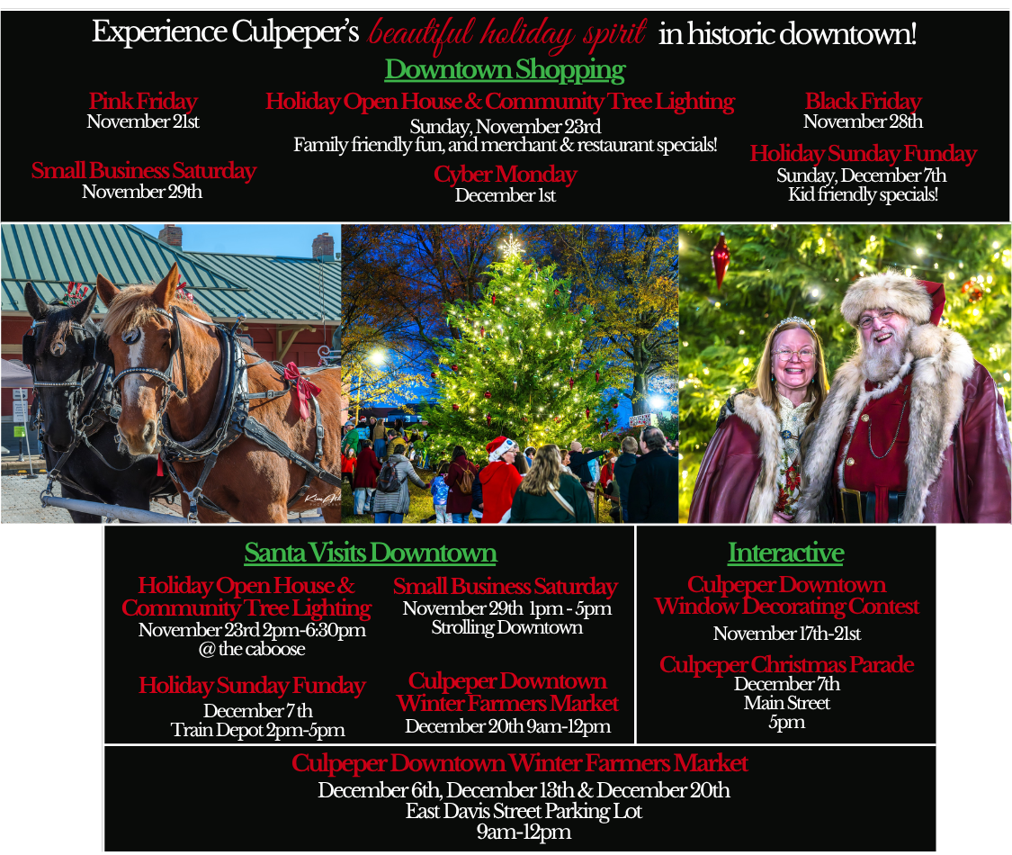 Culpeper Downtown for the season is sure to deliver holiday fun and merriment around every corner throughout November and December!Β  Explore unique retail shops, fashion boutiques, along with breweries and gourmet foodie experiences!Β  Spend time in Culpeper’s idyllic downtown, soaking up all the small town feels, with a variety of shopping holidays, Santa visits and so much more!