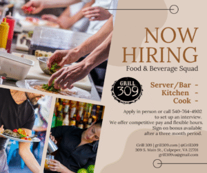 Apply in person or call 540-764-4902 to set up an interview. Competitive pay and flexible hours. Sign on bonus available after three month period.